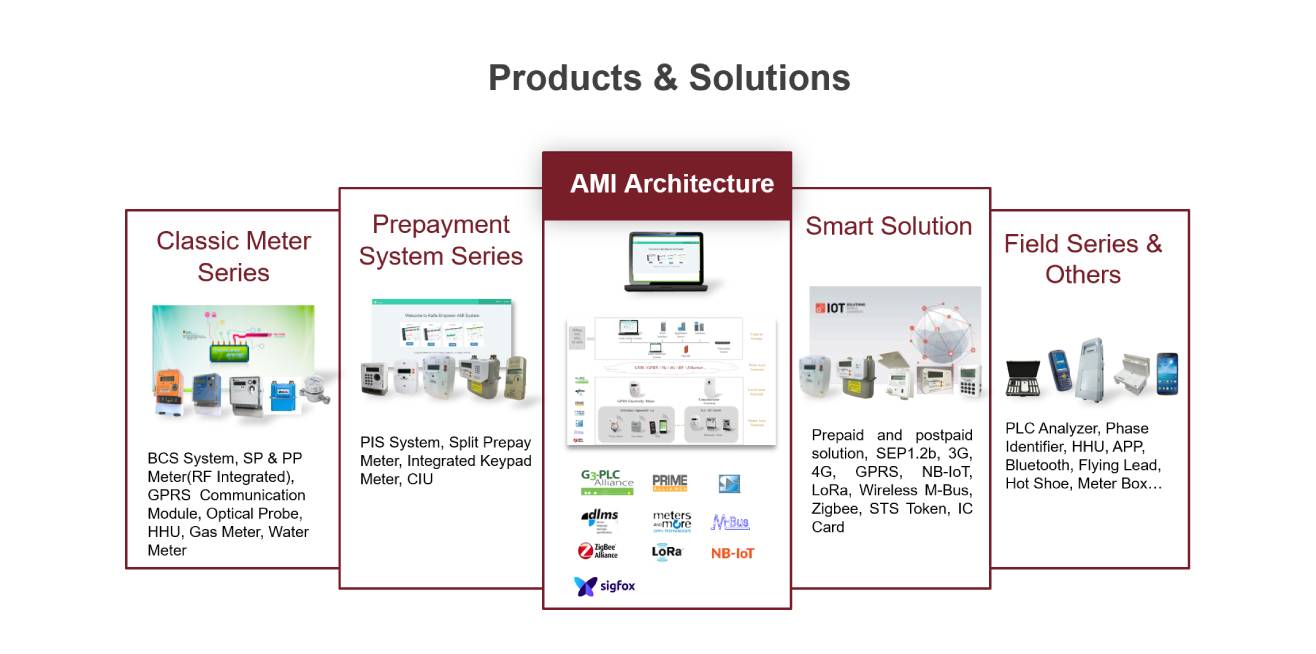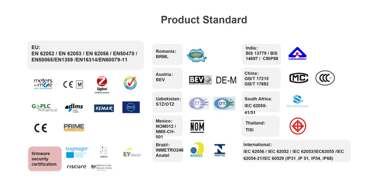 Provides comprehensive smart metering solutions, including classic meters, smart meters, prepayment systems, AMI systems, and field application tools. Supports various communication solutions, including PLC (G3, PRIME), RF-Mesh, LoRaWan, Wi-SUN, 2G/3G/LTE/NB-IoT, ZigBee, and Bluetooth.Products are certified with multiple international standards, including MID, DLMS, Meter & More, IDIS, G3, and PRIME, ensuring strict compliance in different markets. Compliant with key product and safety standards such as IEC 62052/53/56 and EN 50470/50065. Adheres to strict international security protocols and has obtained various international security certifications.