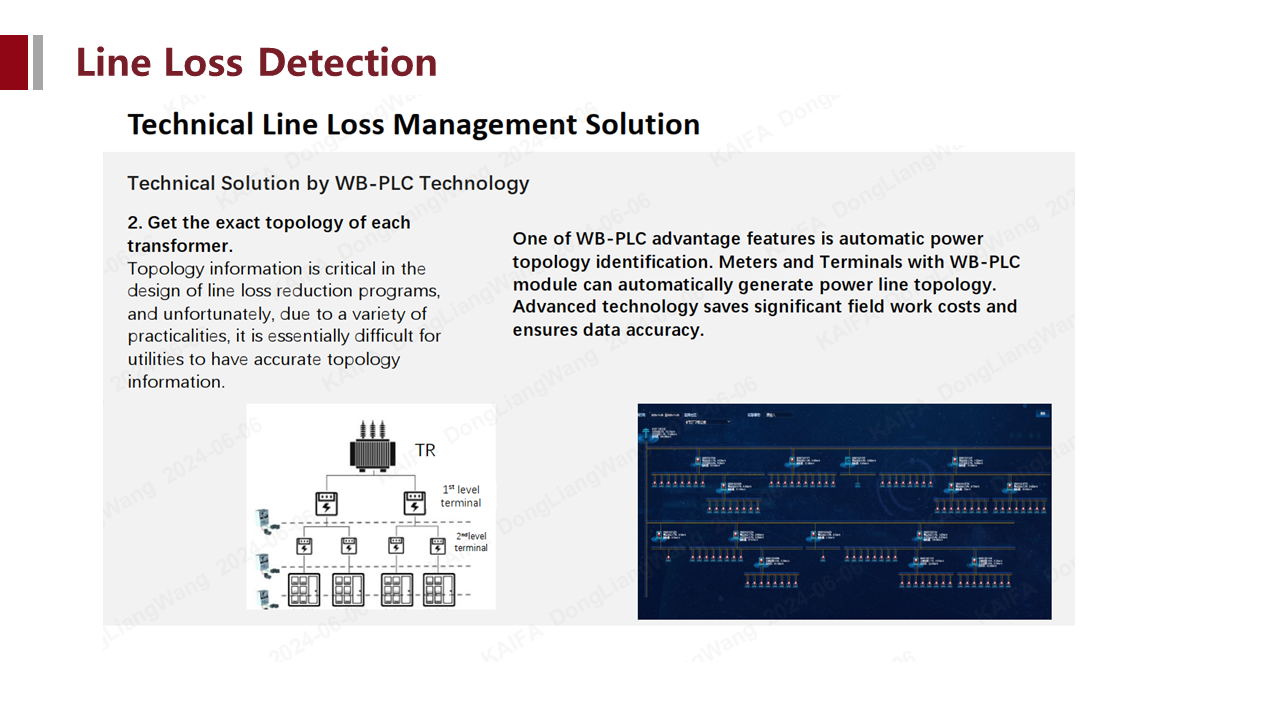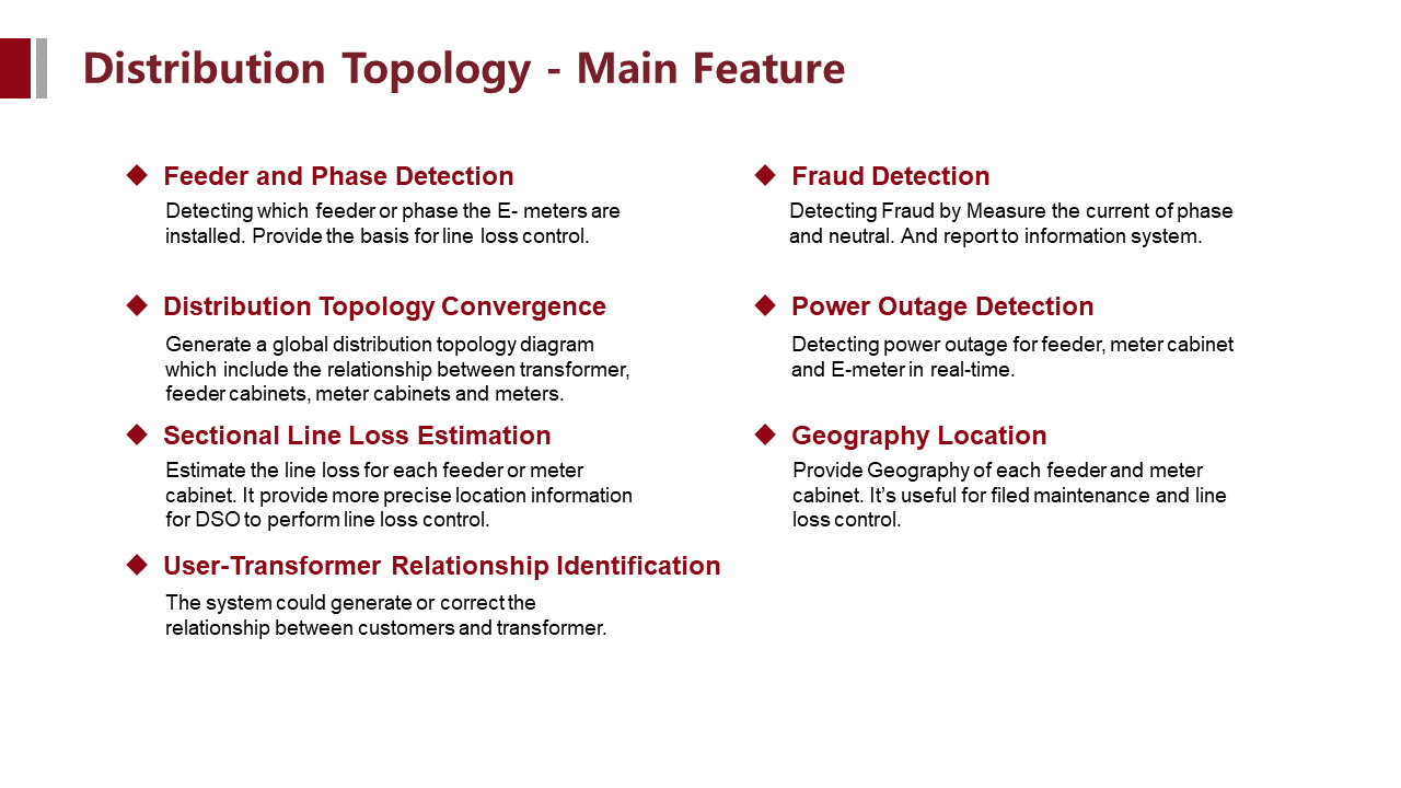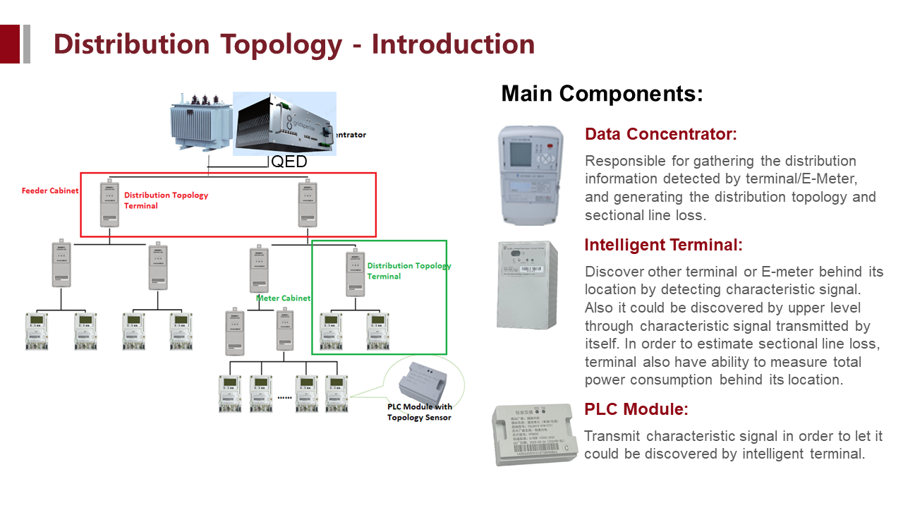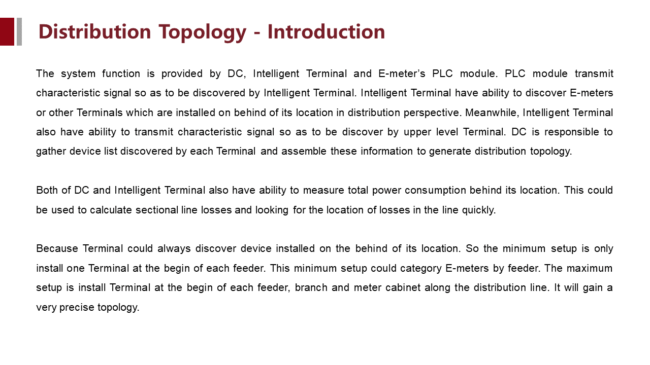 The system function is provided by DC, Intelligent Terminal and E-meter’s PLC module. PLC module transmit characteristic signal so as to be discovered by Intelligent Terminal. Intelligent Terminal have ability to discover E-meters or other Terminals which are installed on behind of its location in distribution perspective. Meanwhile, Intelligent Terminal also have ability to transmit characteristic signal so as to be discover by upper level Terminal. DC is responsible to gather device list discovered by each Terminal and assemble these information to generate distribution topology.
