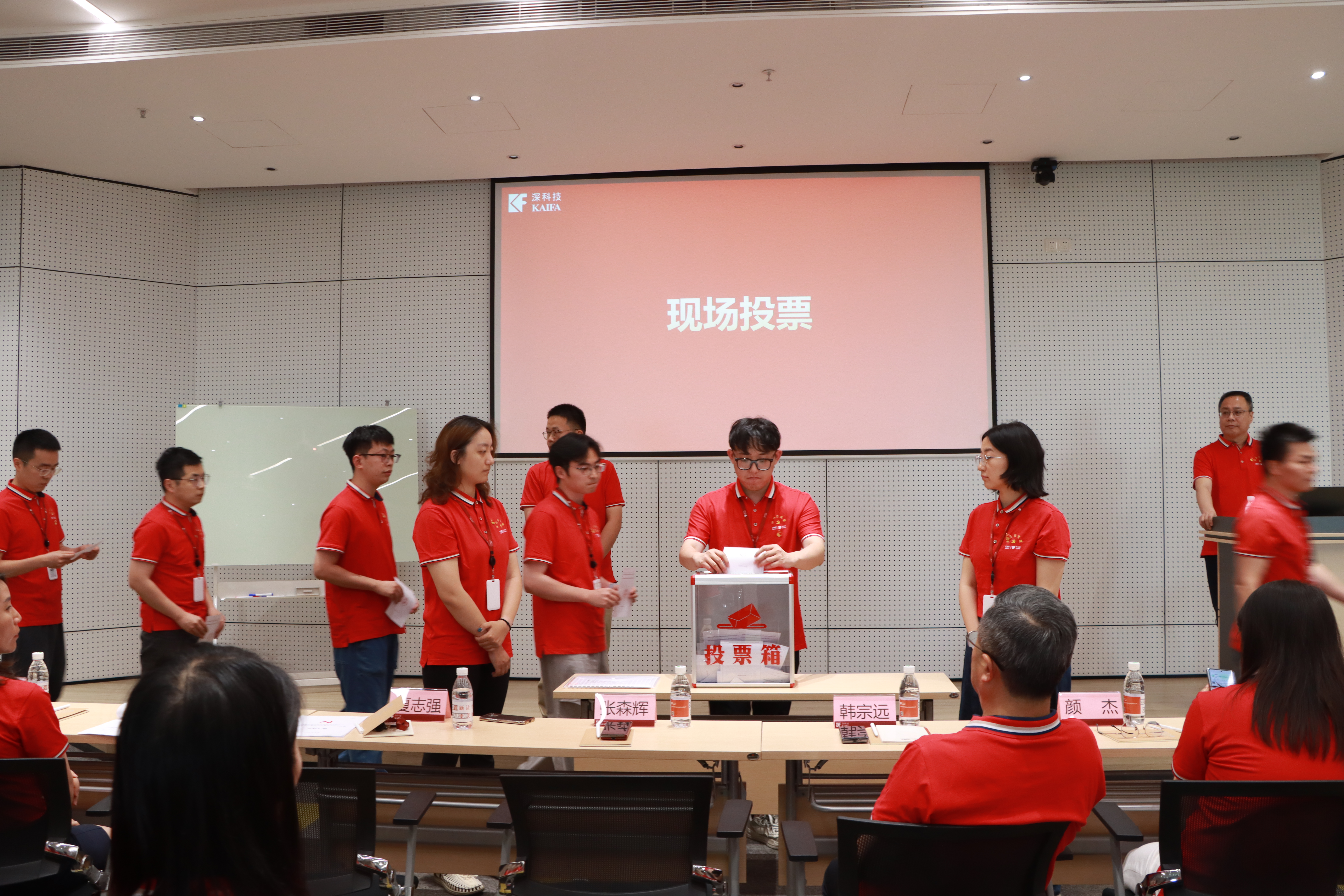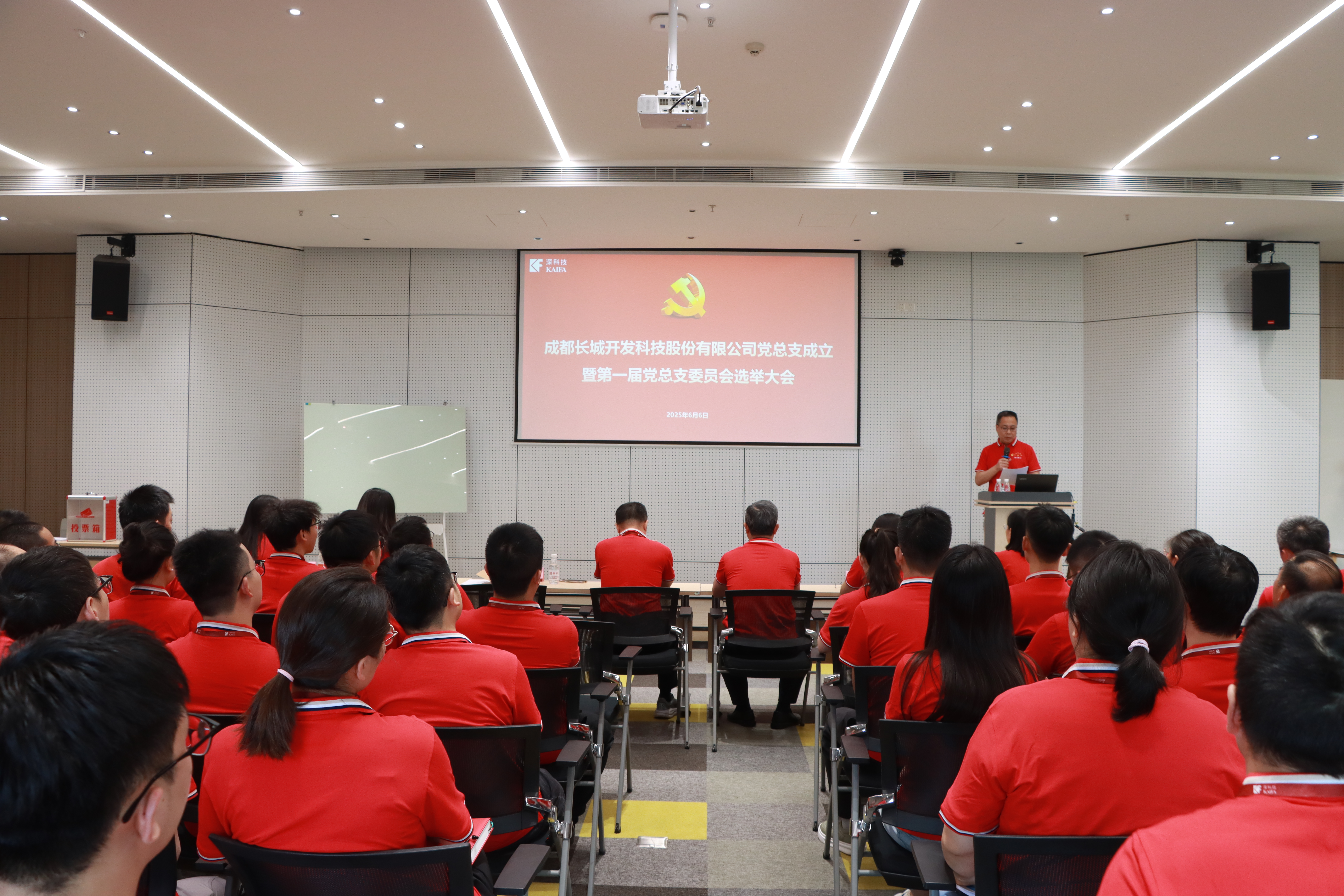 2025 年6月6日,中共成都长城开发科技股份有限公司党总支成立暨第一届党总支委员会选举大会在四楼多功能厅隆重举行。深科技党委书记、董事长韩宗远,党群工作部高级经理刘宁莅临指导,公司全体党员参加会议。