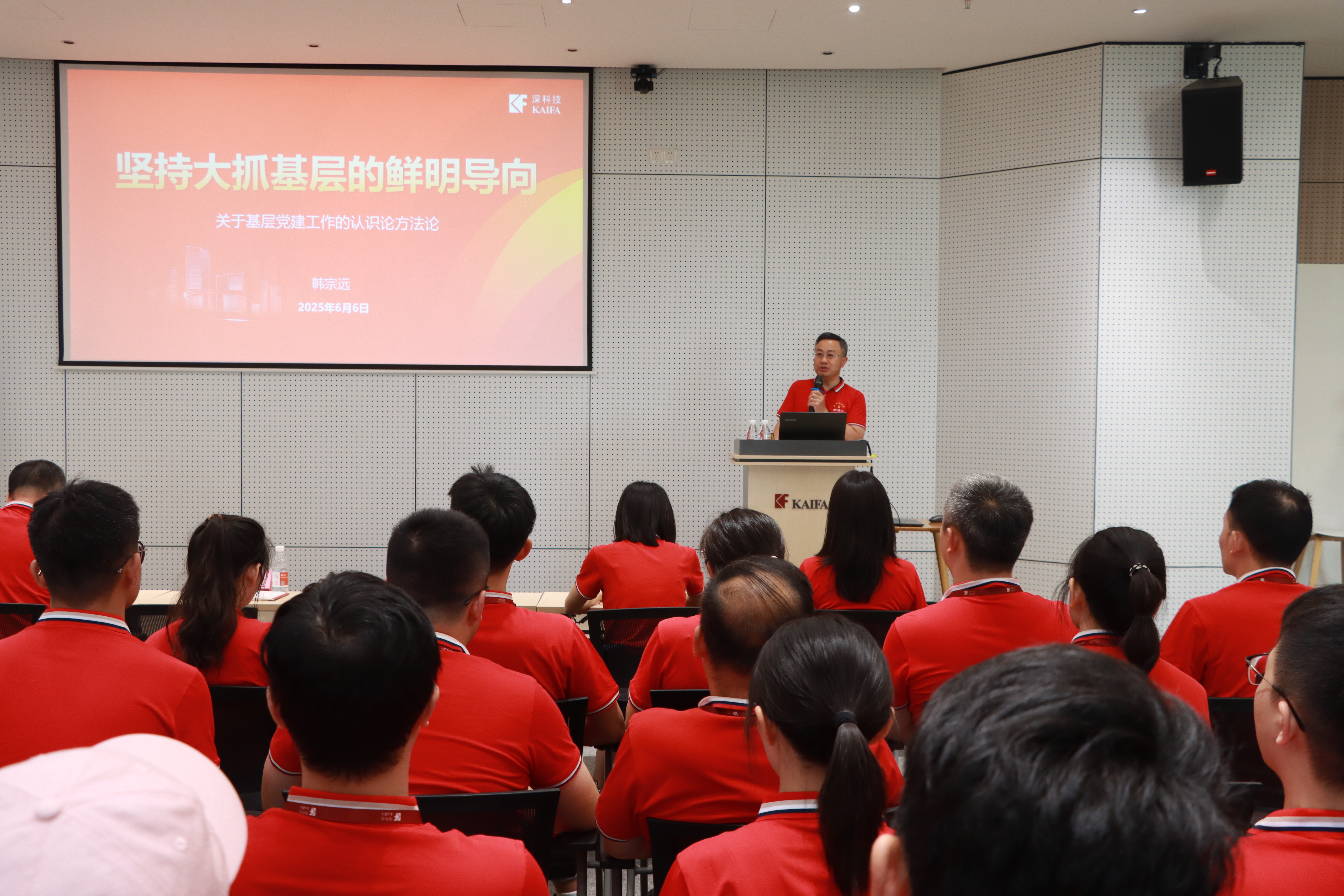 在随后的专题党课中,韩宗远以《坚持大抓基层的鲜明导向》为题,从“基层党建是什么、怎么看、怎么干”三个方面,详细阐述了基层党建的地位与任务、重点与难点,以及深科技党建工作的方法和路径。他的党课既有高瞻远瞩的理论视野,又结合了基层党建的生动实践,系统阐释了新时代党建工作的核心逻辑,为公司党建工作搭建了 “理论认知 — 实践操作”的完整思维框架,为公司党建工作的开展提供了有力的指导。